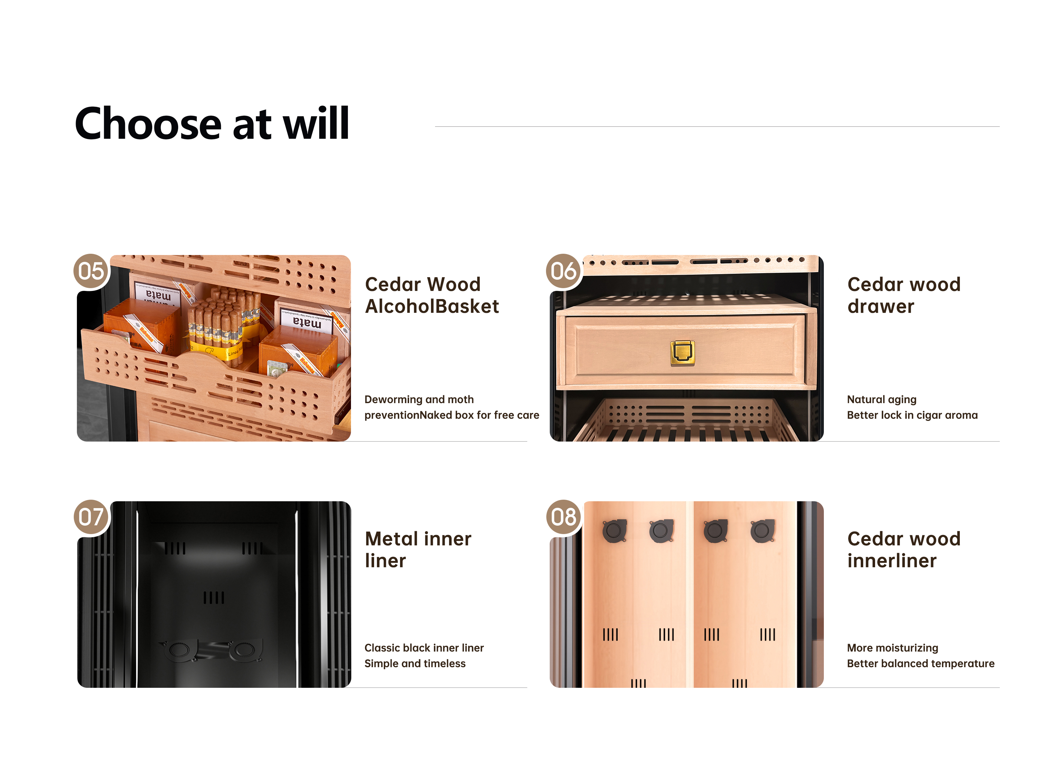 Selected Spanish cedar shelves and drawers create a more suitable environment for cigar storage while adding a natural premium finish.